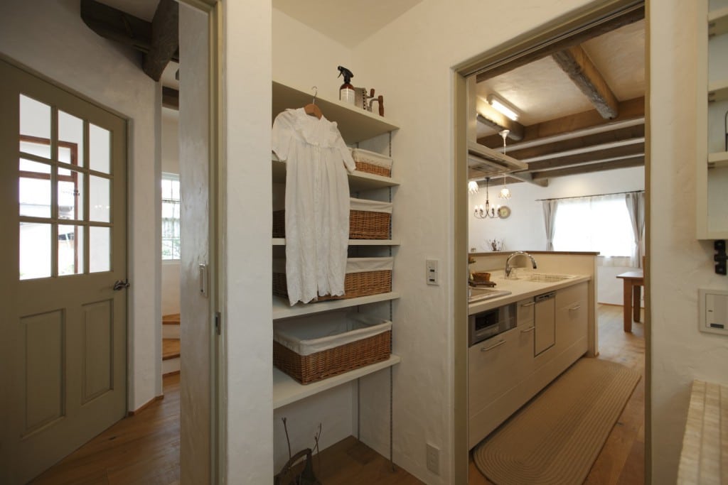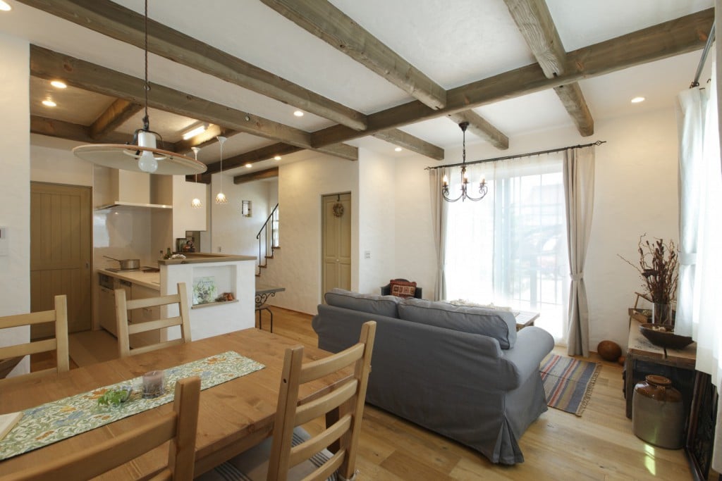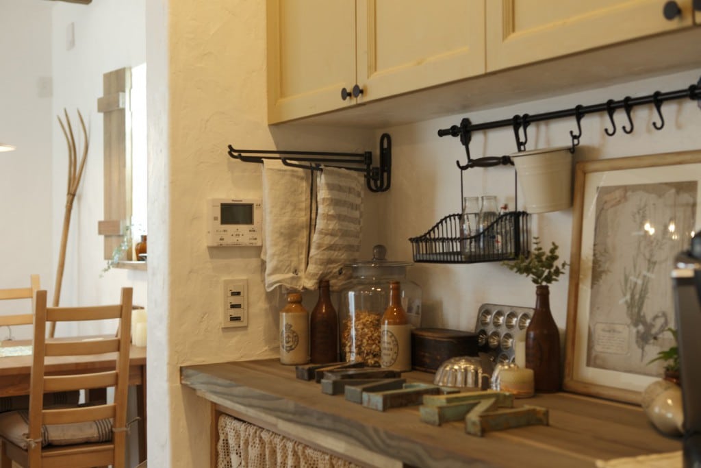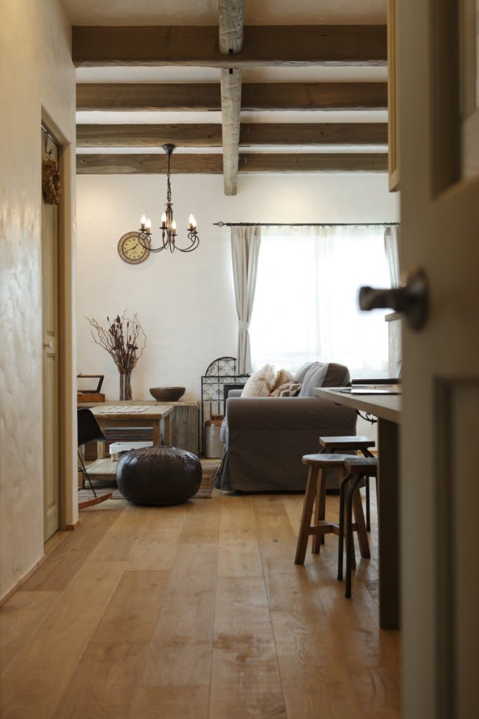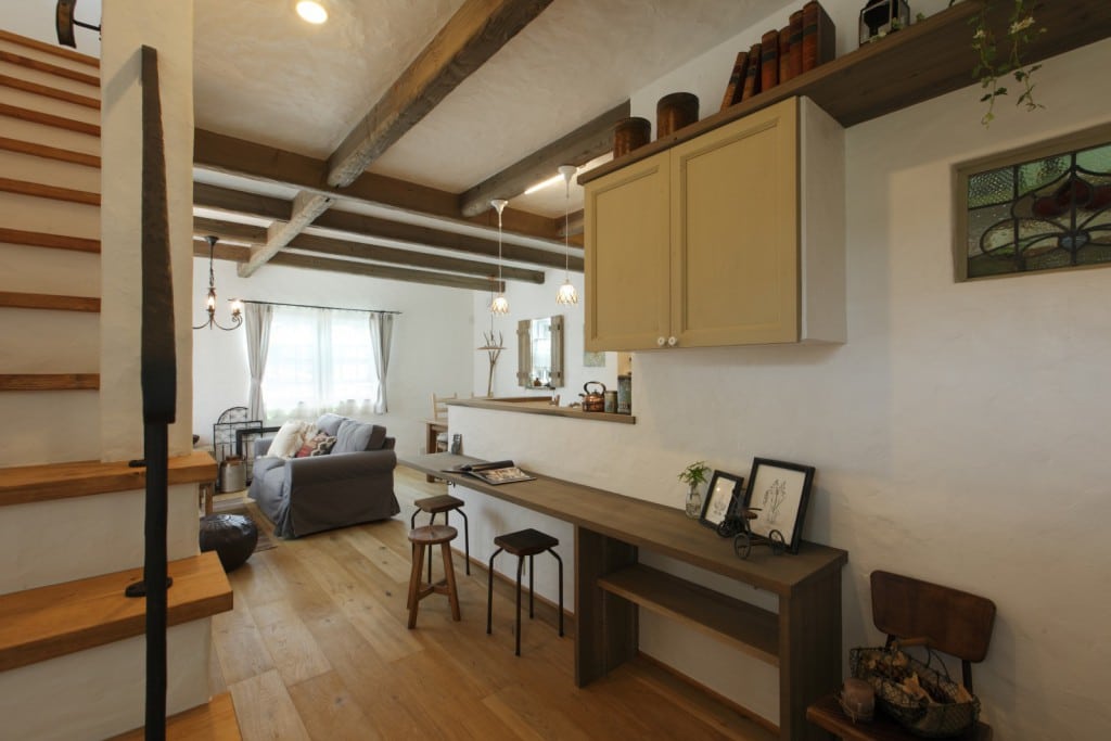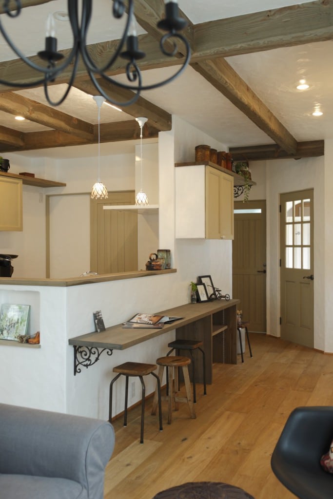 010-1024x704 046-819x1024 005-1024x683 013-683x1024 003-1024x683 004-1024x683 007-1024x696 018-1024x683 025-680x1024 023-683x1024 015-683x1024 011-683x1024 027-1024x683 029-1024x683 028-683x1024 プティ・ラフェルムはシンプルながら表情豊かな漆喰が魅力。その魅力を存分に活かすため外観はすっきりと。陽が沈みかけてくると、絶妙に配置された窓から明かりが溶け出し、素敵な趣きを醸し出します。やわらかで落ち着いた風合いは、日本的な庭とも違和感なくマッチします。和と洋を組み合わせたアイデアが光っています。 室内も漆喰の白をベースとして、木のあたたかさを活かした空間デザインが特徴。天井には、傷跡をつける独自の「カーヴ&スクラッチ工法」を用いたオーク材の梁がアクセントとなり、味わいがプラスされています。大きな窓がこだわりポイントで、リビングソファーとサイズを合わせることで、自慢の庭を眺める特等席のできあがり。ここにも、庭を大切にする施主様のアイデアが込められています。 ダイニングテーブルとチェアも、床や窓枠と馴染む木製のものをチョイス。窓からの光と優しい照明が、落ち着きある食卓を演出します。ご家族での会話も弾む、楽し気な食卓が目に浮かびます。 リビングに抜ける廊下は、開放感を重視した広めの設計。脇にはちょっとしたテーブルやアンティーク小物が並び、どこか可愛さを感じる空間作り。階段には明るめの木材を使い、広めにスペースを取ることで、ゆったりと登りやすい工夫がされています。 キッチンには、収納用に手作りのアンティーク調家具を使用。外から見える部分に家全体との統一感を持たせることで、グッと印象がまとまります。 キッチンに並ぶボトルもアンティーク調のものを取り入れれば、味わいのある雰囲気がグッと増して、料理がさらに楽しくなってしまいそう。 照明やテーブルの支え、ドアノブなどのちょっとした部分には、造作アイアンを取り入れアクセントに。黒のシャープさと丸みのあるデザインの部材が、部屋と調和した絶妙なバランスで映えています。 リビングスペースは、少しトーンを抑えた色合いで統一。エイジング加工を施したテーブルなどを置くことで、落ち着きある「古美た」風合いを楽しめるくつろぎスペースに。ダイニングとは少し違う雰囲気を演出することでメリハリが生まれ、日常の場面ごとに違った楽しみ方が生まれています。 洗面・洗濯スペースは、キッチンと繋いでおり、水回りをまとめ家事の動線を楽にするアイデアが込められています。ご家族の出入りが多い場所のため、二つの方向からアクセスできる作りで利便性を高めています。 洗面台は白を基調として、スッキリと清潔感のある印象に。日々身づくろいする場所でもあるため、明るい空間づくりにこだわっています。 デザインだけでなく実際の生活をイメージしたアイデアを自由に組み込める点も、プティ・ラフェルムの魅力の一つです。