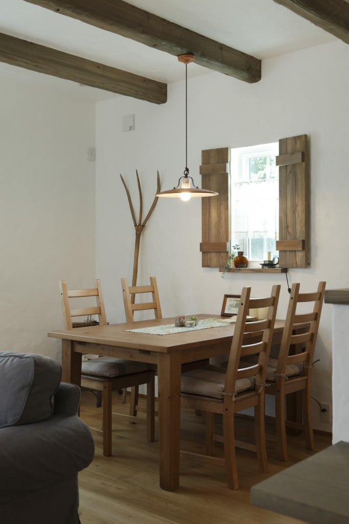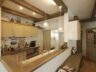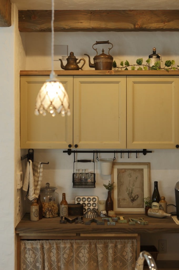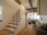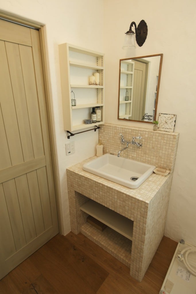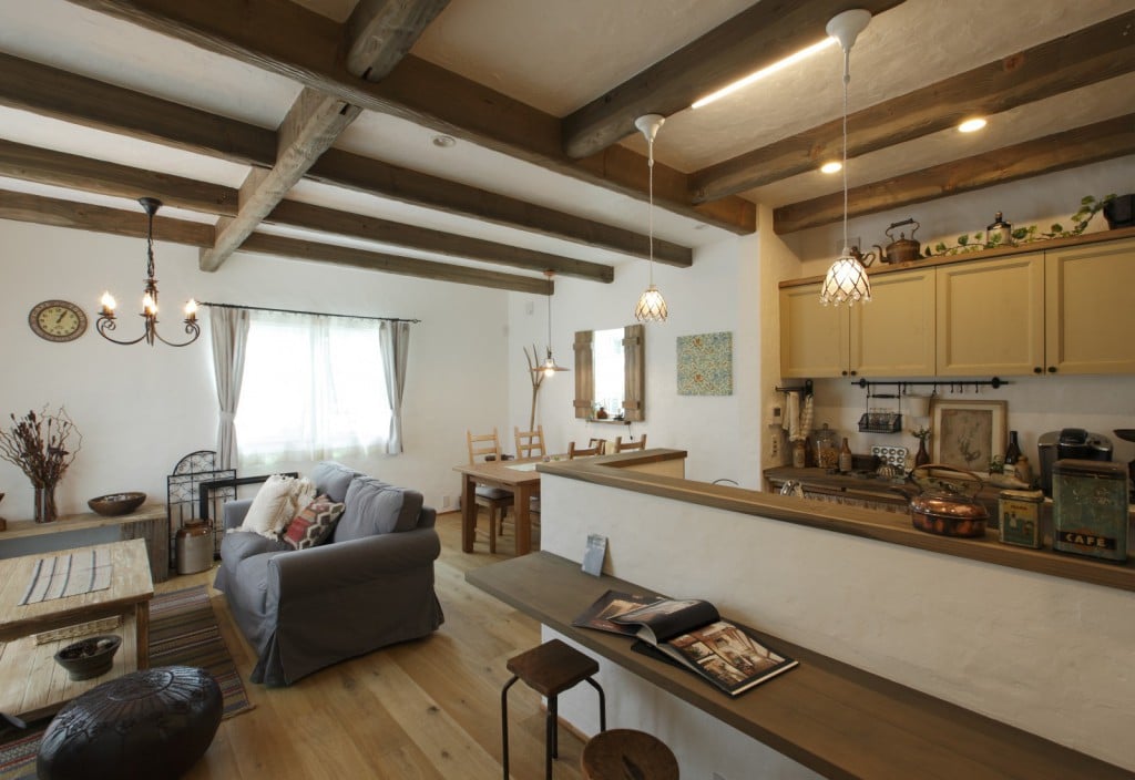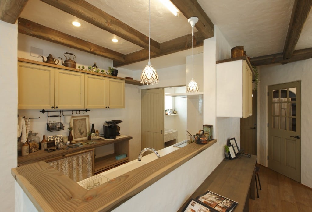 010-1024x704 046-819x1024 005-1024x683 013-683x1024 003-1024x683 004-1024x683 007-1024x696 018-1024x683 025-680x1024 023-683x1024 015-683x1024 011-683x1024 027-1024x683 029-1024x683 028-683x1024 プティ・ラフェルムはシンプルながら表情豊かな漆喰が魅力。その魅力を存分に活かすため外観はすっきりと。陽が沈みかけてくると、絶妙に配置された窓から明かりが溶け出し、素敵な趣きを醸し出します。やわらかで落ち着いた風合いは、日本的な庭とも違和感なくマッチします。和と洋を組み合わせたアイデアが光っています。 室内も漆喰の白をベースとして、木のあたたかさを活かした空間デザインが特徴。天井には、傷跡をつける独自の「カーヴ&スクラッチ工法」を用いたオーク材の梁がアクセントとなり、味わいがプラスされています。大きな窓がこだわりポイントで、リビングソファーとサイズを合わせることで、自慢の庭を眺める特等席のできあがり。ここにも、庭を大切にする施主様のアイデアが込められています。 ダイニングテーブルとチェアも、床や窓枠と馴染む木製のものをチョイス。窓からの光と優しい照明が、落ち着きある食卓を演出します。ご家族での会話も弾む、楽し気な食卓が目に浮かびます。 リビングに抜ける廊下は、開放感を重視した広めの設計。脇にはちょっとしたテーブルやアンティーク小物が並び、どこか可愛さを感じる空間作り。階段には明るめの木材を使い、広めにスペースを取ることで、ゆったりと登りやすい工夫がされています。 キッチンには、収納用に手作りのアンティーク調家具を使用。外から見える部分に家全体との統一感を持たせることで、グッと印象がまとまります。 キッチンに並ぶボトルもアンティーク調のものを取り入れれば、味わいのある雰囲気がグッと増して、料理がさらに楽しくなってしまいそう。 照明やテーブルの支え、ドアノブなどのちょっとした部分には、造作アイアンを取り入れアクセントに。黒のシャープさと丸みのあるデザインの部材が、部屋と調和した絶妙なバランスで映えています。 リビングスペースは、少しトーンを抑えた色合いで統一。エイジング加工を施したテーブルなどを置くことで、落ち着きある「古美た」風合いを楽しめるくつろぎスペースに。ダイニングとは少し違う雰囲気を演出することでメリハリが生まれ、日常の場面ごとに違った楽しみ方が生まれています。 洗面・洗濯スペースは、キッチンと繋いでおり、水回りをまとめ家事の動線を楽にするアイデアが込められています。ご家族の出入りが多い場所のため、二つの方向からアクセスできる作りで利便性を高めています。 洗面台は白を基調として、スッキリと清潔感のある印象に。日々身づくろいする場所でもあるため、明るい空間づくりにこだわっています。 デザインだけでなく実際の生活をイメージしたアイデアを自由に組み込める点も、プティ・ラフェルムの魅力の一つです。